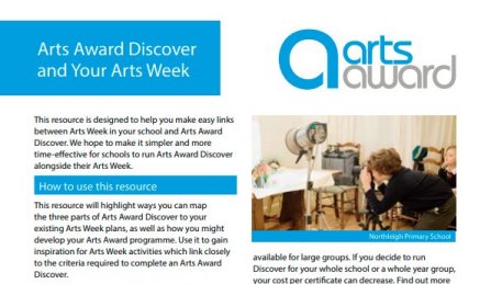 This resource is designed to help you make easy links between Arts Week in your school and Arts Award Discover. With this resource we hope to make it simpler and more time-effective for schools to run Arts Award Discover alongside their existing Arts Week activities.