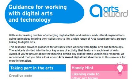 This resource is designed to support advisers when working with young people using digital arts and technology as part of Arts Award. From creating art using digital tools, to using tech to enhance the audience experience. Our handy guide will help you to keep the essential Arts Award assessment criteria in mind.