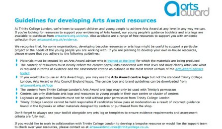 *Please be aware that if you do choose to create your own resources or models for collecting evidence for Arts Award without, or inaccurately referring to the toolkit, Trinity cannot take responsibility for any issues raised at moderation or if the children and young people do not pass.